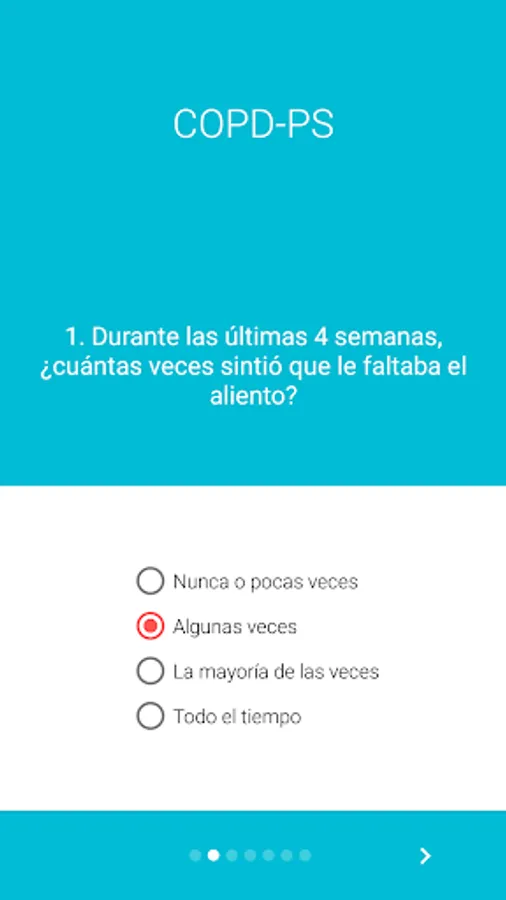 - Diagnostics: The application integrates 4 indexes related to the diagnosis of COPD, which are: COPD-PS, CAT, BODE and BODEx. The patient can obtain a diagnosis of the degree of COPD by completing the corresponding questionnaires.