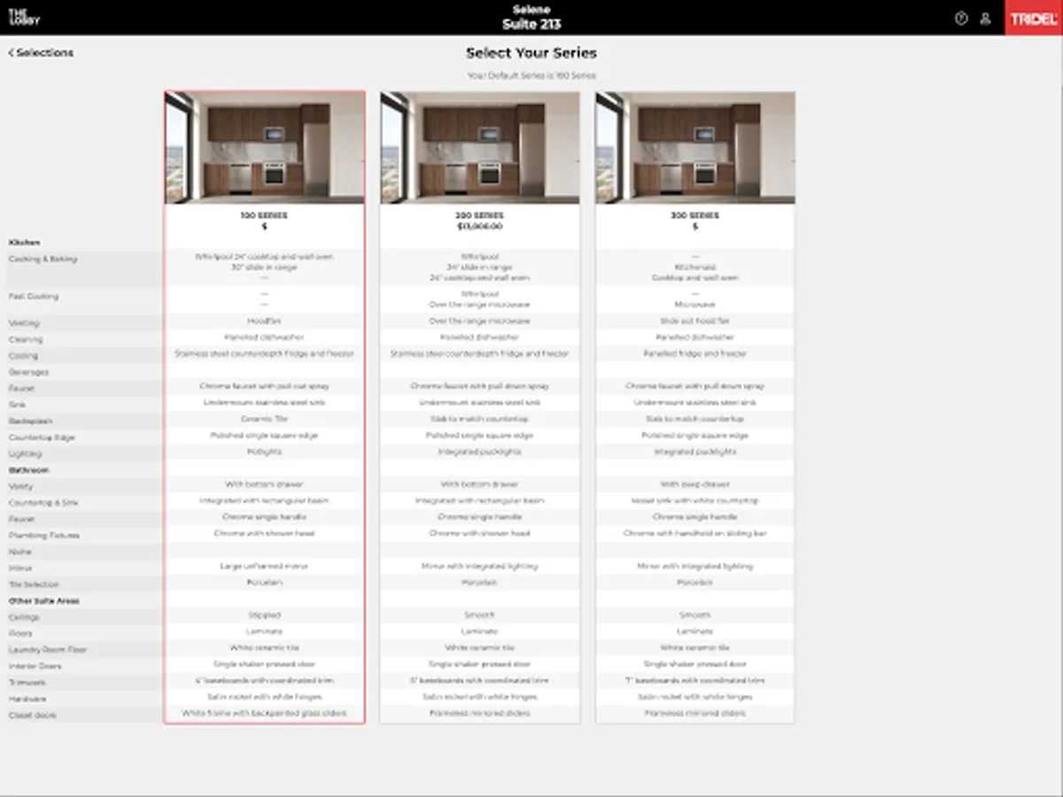 Designing your new home has never been so simple. Tridel Design Studio allows you to review your suite floorplan and select from a wide range of colours and finishes, while the visualizer allows you to see what your new suite will look like in real-time. The entire catalogue of included and personal selection finishes and fixtures is available at your fingertips.