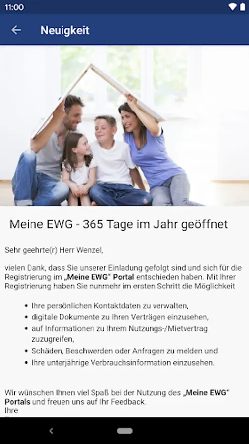 You can use your smartphone or tablet to manage your personal contact details, view digital documents for your contracts, access information about your usage/rental contract, and view your consumption information during the year in accordance with the amended Heating Costs Ordinance. In addition, you can use the Meine EWG app to receive up-to-date information from Erste Wohnungsgenossenschaft Berlin-Pankow eG and have the opportunity to report damage and complaints as well as to make inquiries, regardless of business hours - Meine EWG - open for you 365 days a year.