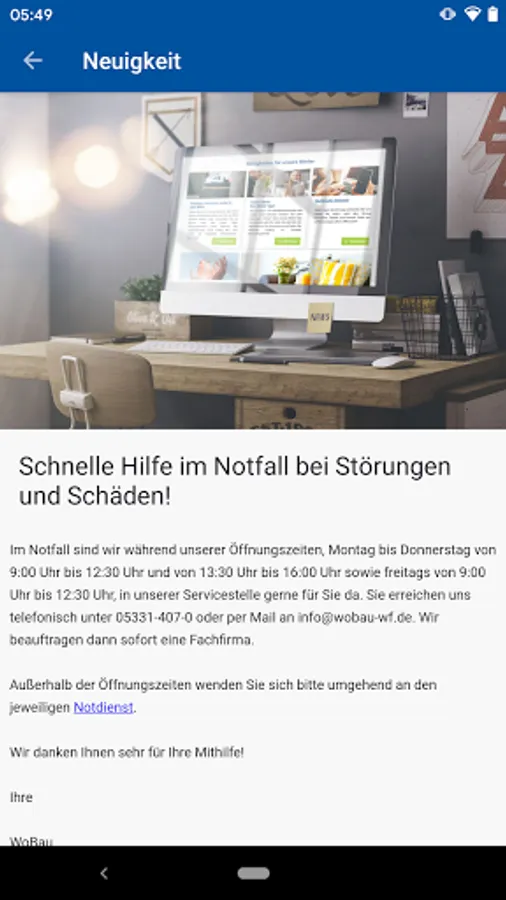 WoBau WF is a free customer app with which you as a tenant of Wolfenbütteler Baugesellschaft mbH (WoBau) can contact us quickly and easily.