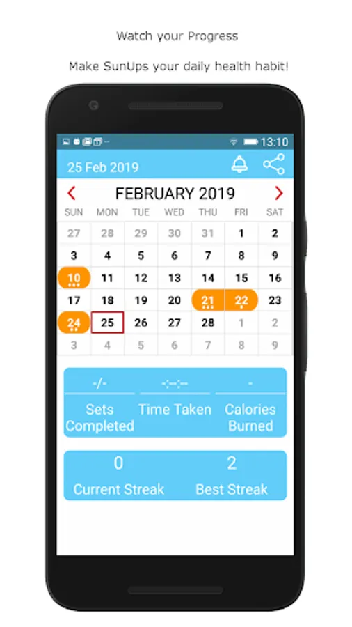 The calendar will show you how many SunUps you did on any particular day. Set an alarm to remind yourself to do SunUps for the next 8 or 21 days to help you make SunUps a daily habit.