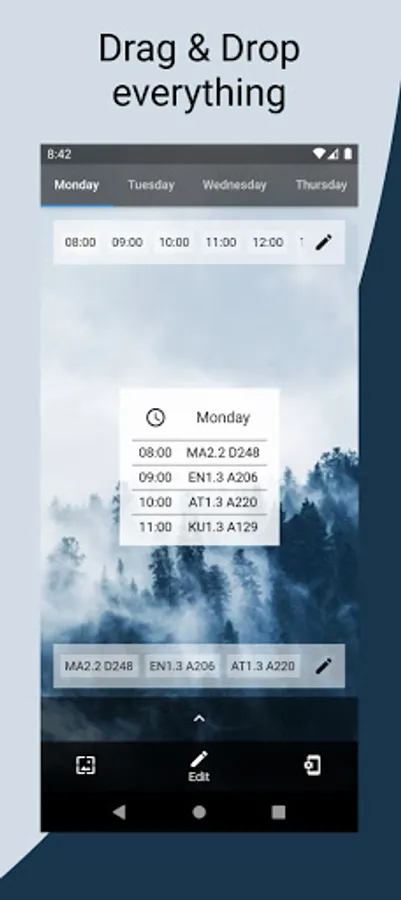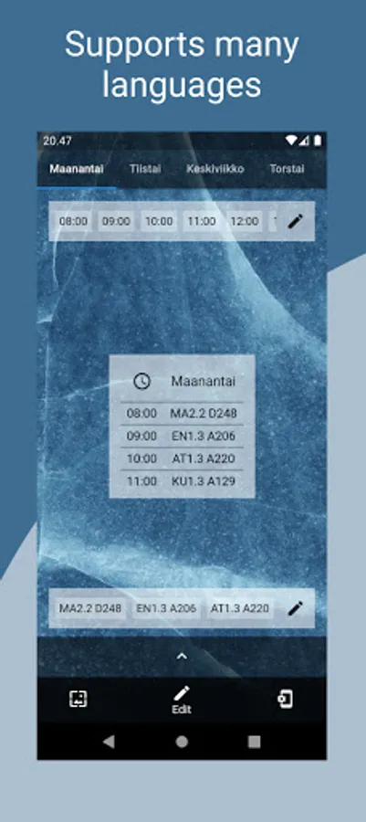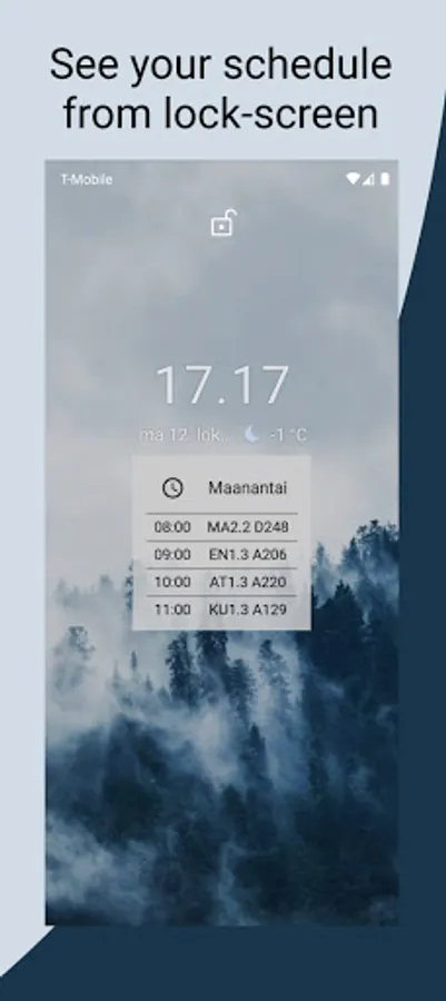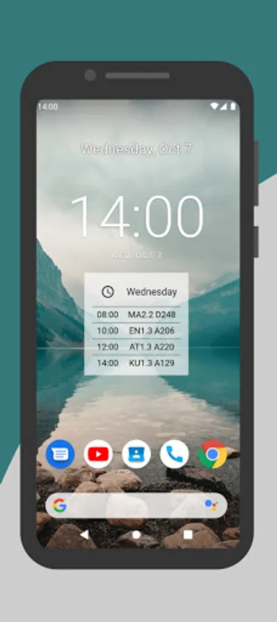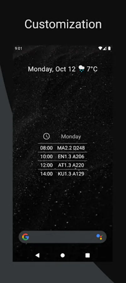 Tabell works as an Android live wallpaper to show your schedule on home-screen and lock-screen. It automatically switches every day, showing only today's schedule. No need to clutter your background!