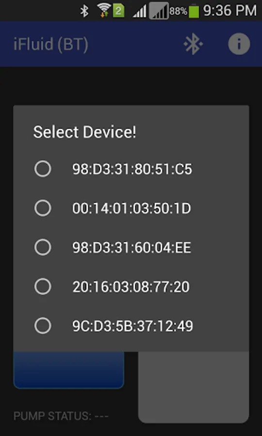 iFluid application requires your phone paired with blue-tooth module. when you will start the application, it will display the MAC address of all paired blue-tooth devices to select from. Now you need to select the MAC address of your blue-tooth module that is connected with the micro-controller on hardware side.