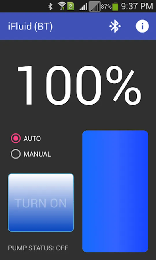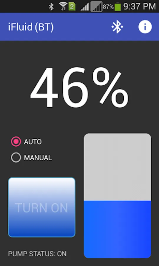 If you select AUTO mode, application will keep the pump ON if fluid level is less than 100%, else it will turn OFF the pump if fluid level reached 100%.