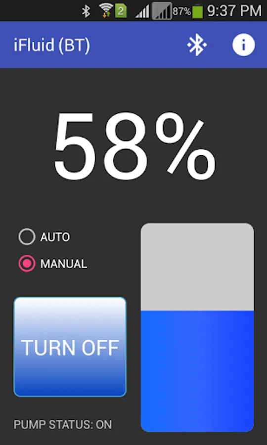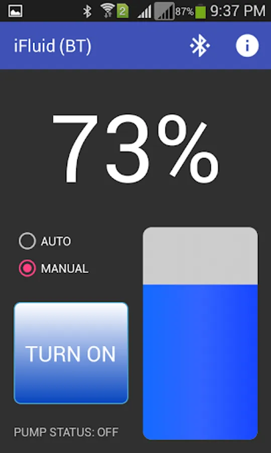 If you select MANUAL mode, toggle button will be enabled for you to manually control the pump at desired fluid levels.