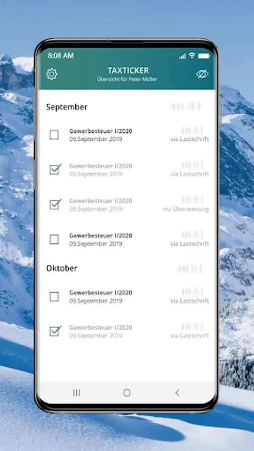 Never miss a tax payment date again. Regardless of whether it is income tax, trade tax, corporate tax prepayments or final payments as well as sales tax and wage tax prepayments. With our TaxTicker you are always up to date - at home or on the go - simply mobile!