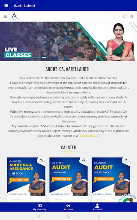 CA Aarti Lahoti's White Labelled App is a learning management system that offers a range of features to students preparing for the CA course. The app includes MCQ exams, video lectures, live classes, and other learning resources.