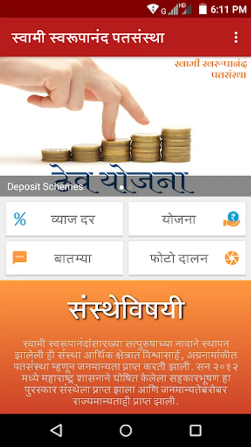 Founded in the name of Swami Swaroopanand, this institution was credited as a credible, prominent credit institution in the financial sector. In 2012, the society received the award "Sahkar Bhushan" declared by the Government of Maharashtra and got the status of statehood with public opinion.