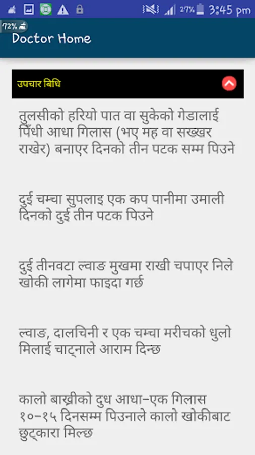 This application provides home remedy for various health issues in english and nepali languages. It also helps to identify various herbs, spices and fruits with diagram. This application only provides treatment for minor health issues and if the health issues are complex please go to hospital and contact doctor.