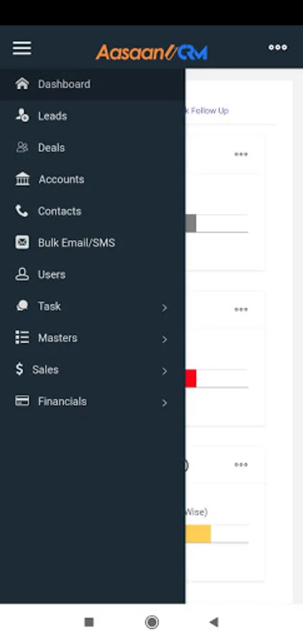 Aasaan Customer Relationship Management has simple sidewise menu to navigate through all the functionalities which makes it easier for the user, particularly in India where people are still not tech savvy if we leave the major cities in India.