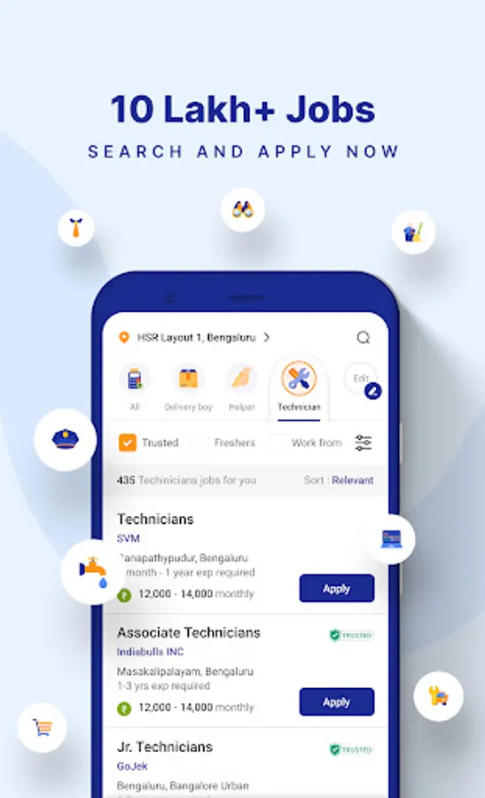 We have 5 Lacs+ jobs in Delivery Boy, Customer Care, Accountant, Back Office Executive, Cashier, Computer Operator, Data Entry, Driver, IT Support, Office Assistant, Sales/Business Developments, Technician etc. in cities like Bengaluru, Delhi, Mumbai, Chennai, Kolkata, Ahmedabad, Pune, Hyderabad and 100+ more cities.