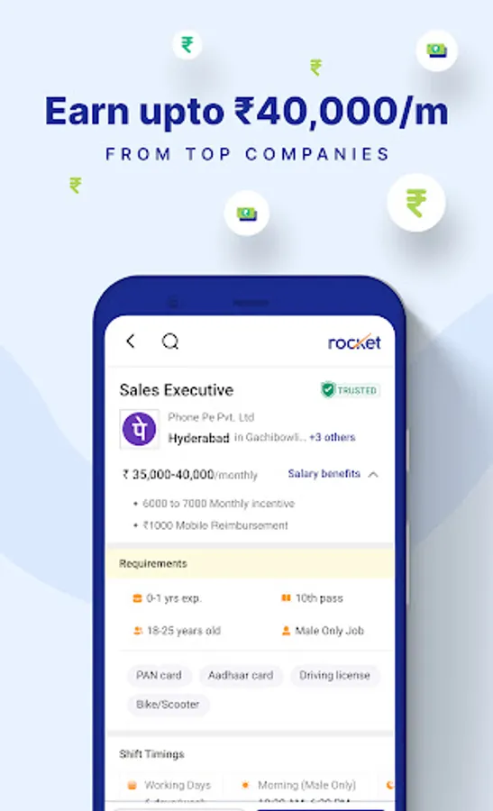 Rocket App is a job search app in India, and a hiring platform that provides professional networking and skill development services, that connects talented frontline workers with genuine employers.