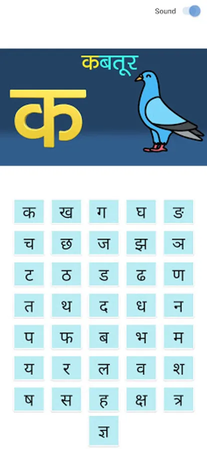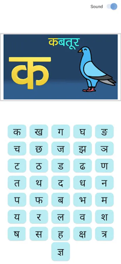 This app would help kids to learn, recognise and pronounce hindi characters.