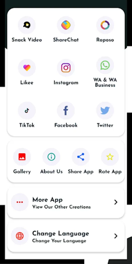 Video and status saver app , High-Quality Interface, User Experience We Support Many Downloaders From Social Like, Facebook Downloader, WhatsApp Status Downloader, Instagram Downloader, Tiktok Downloader, ShareChat Downloader, Twitter Downloader, Roposo Downloader, Likee Downloader.