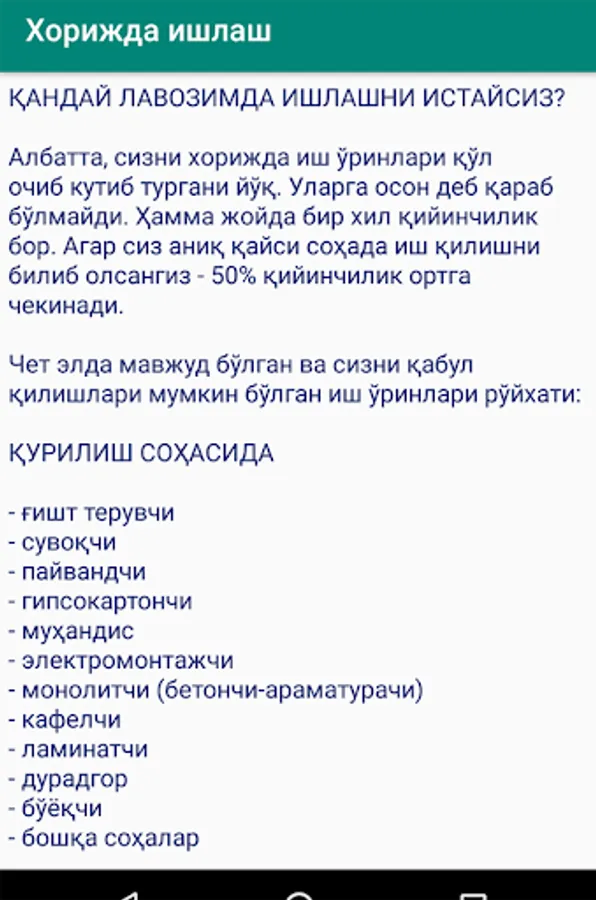 Koreyada ishlash yo‘llari. Ish topish uchun nima qilish kerak? Chet elda ishlash shartlari. Novegiyada ish, Germaniyada ish, Amerikada ishlash, Kanada ishlari. Yevropa davlatlariga borish shartlari.