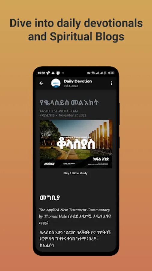 Stay connected and engaged wherever you go with the AASTU ECSF App. Dive into daily devotionals, spiritual blogs, and uplifting Bible verses that nourish your soul on the move. Never miss a fellowship with our weekly time reminder feature, ensuring you stay on top of your spiritual journey.