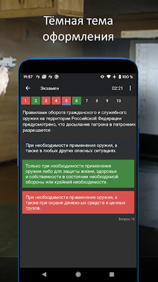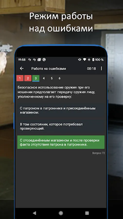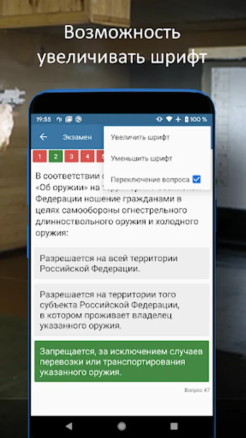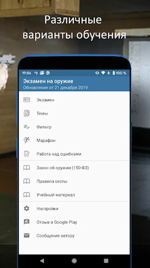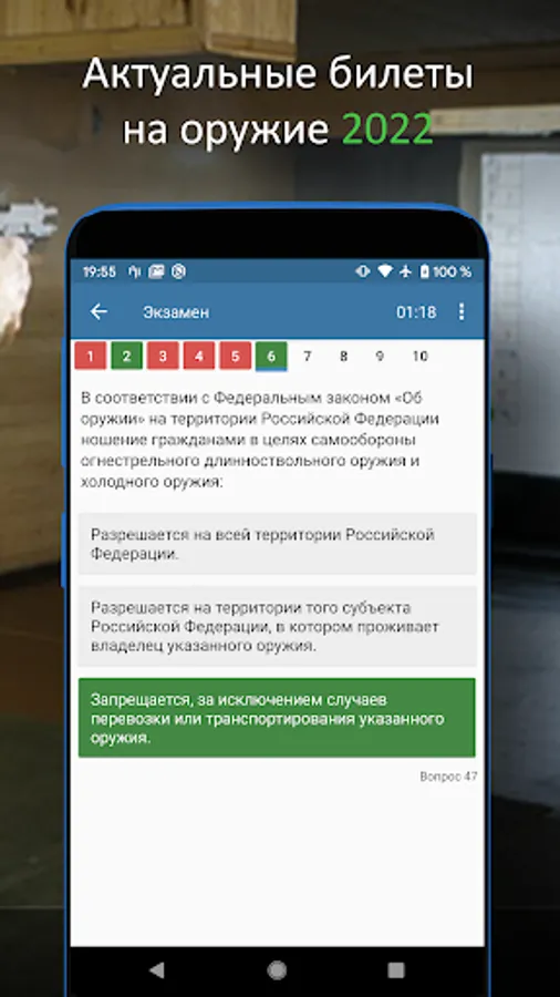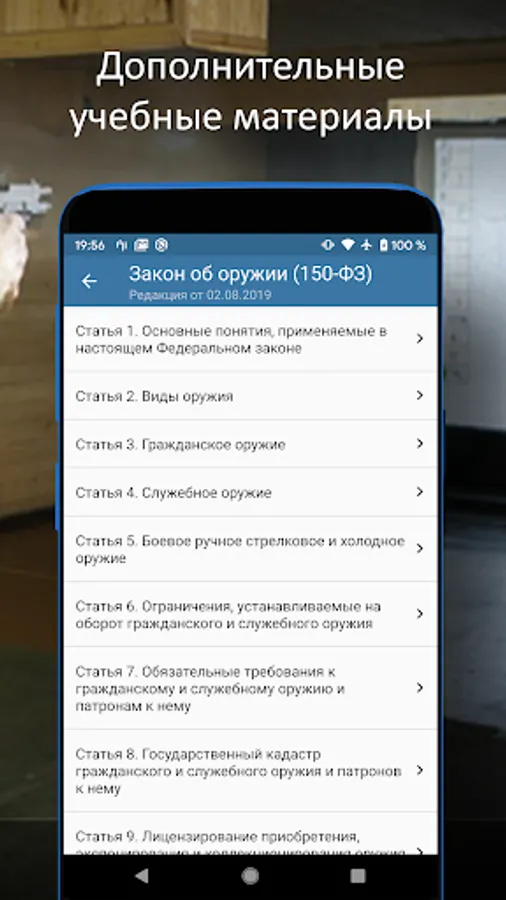 An effective application for preparing for passing the theoretical exam for the safe handling of weapons BOO (including the updated law "On Weapons" (150-FZ)).