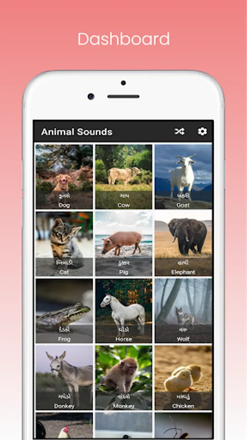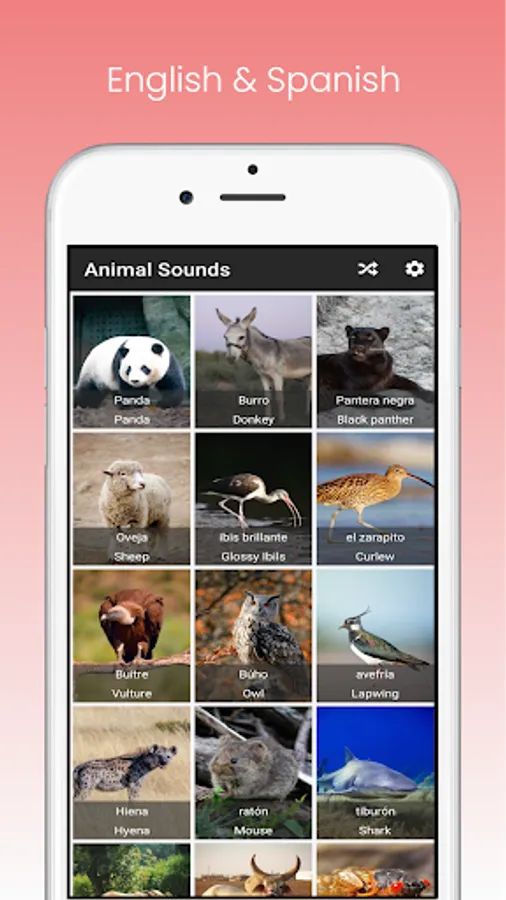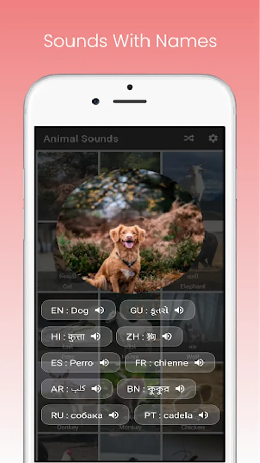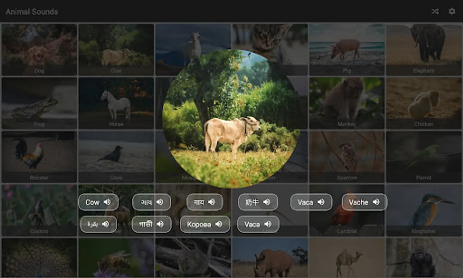 In this Animal Sound app, You can easily listen the animal's or bird's name in different languages like in English, Gujarati, Hindi, Arabic, French, Portuguese, Spanish, Mandarin, Bengali, Russian. You need to just select the language from the settings screen only.