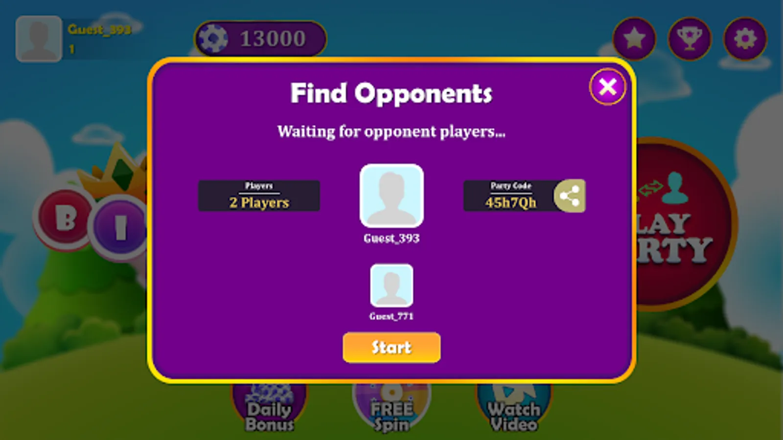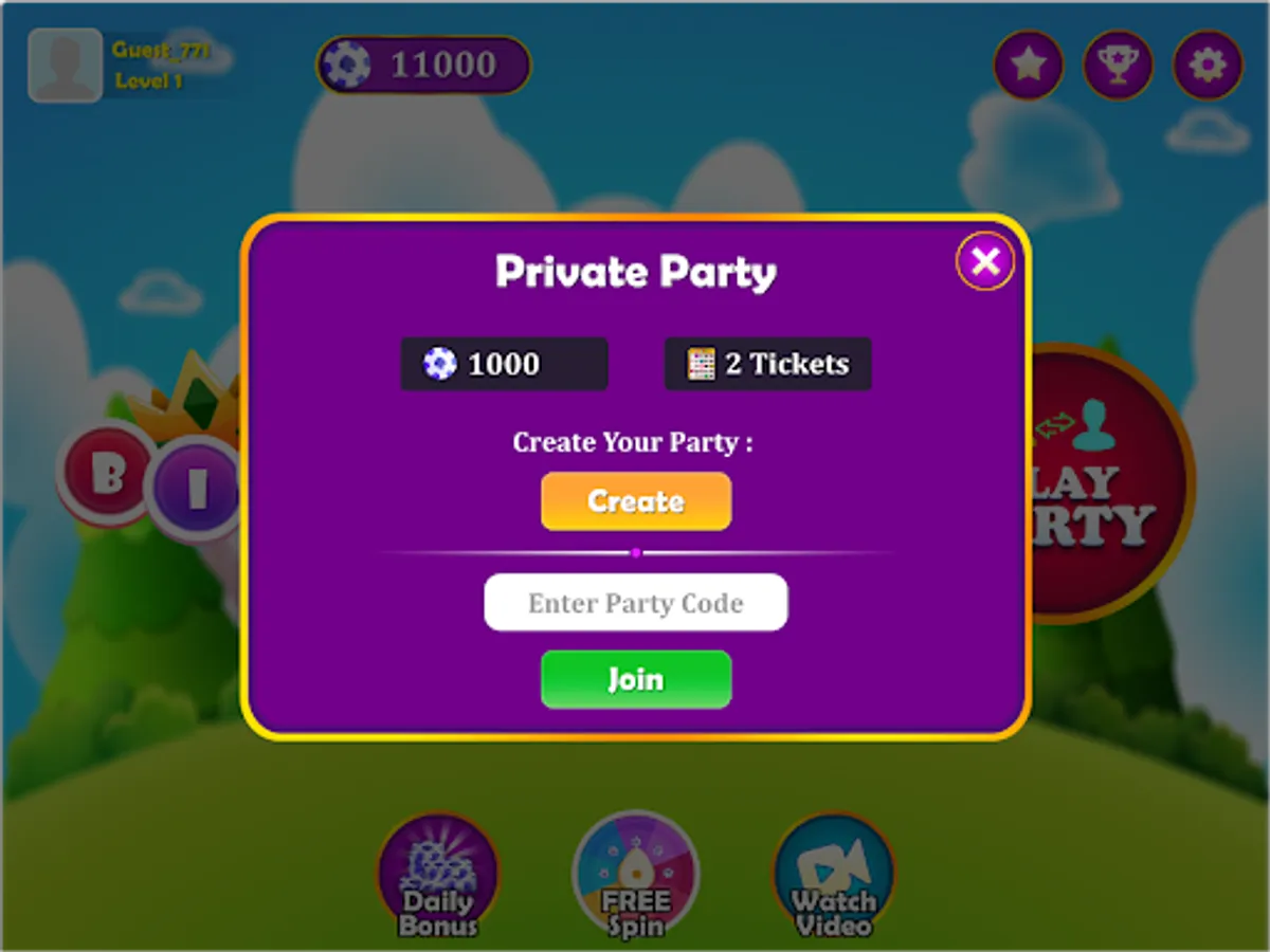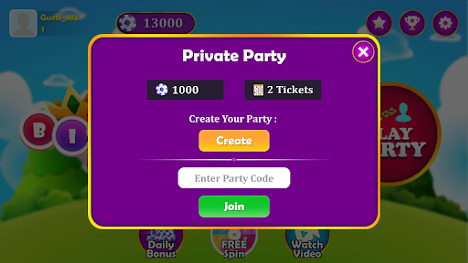 You can create your own private party and invite friends to join the party by sharing party code to play online bingo games. You can create it by pressing “Create” button, else enter party code to join existing party.