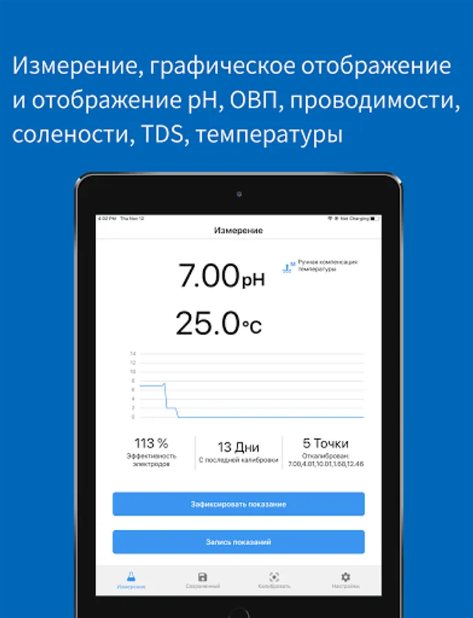 Displays pH, conductivity, salinity or TDS with temperature readings along with electrode efficiency, last calibration date and real-time graph.