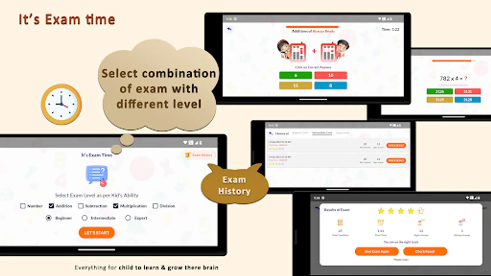 - Exam : Select exam level as per your kid's Ability and determine result.