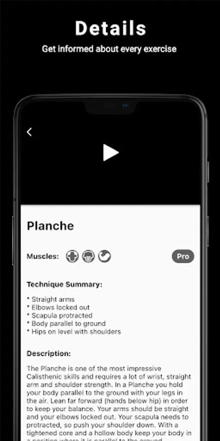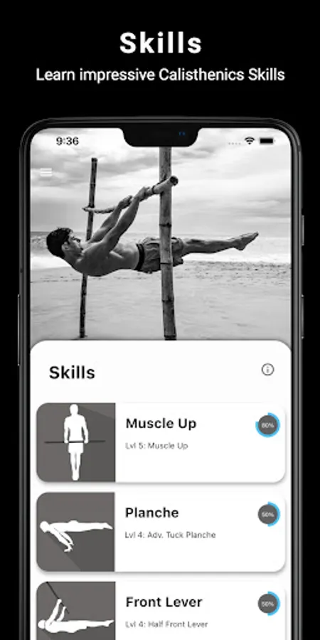 Thenics will guide you with descriptions and technique explanation of the skills and progressions. Every skill is divided into several PROGRESSIONS which include different workouts. Thereby you are able to learn skills step by step adapted to your current level.
