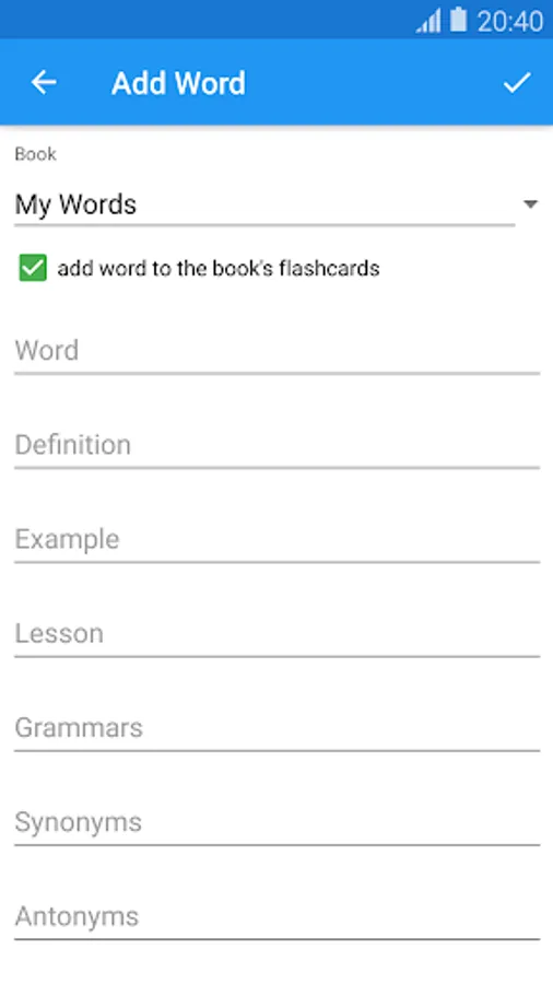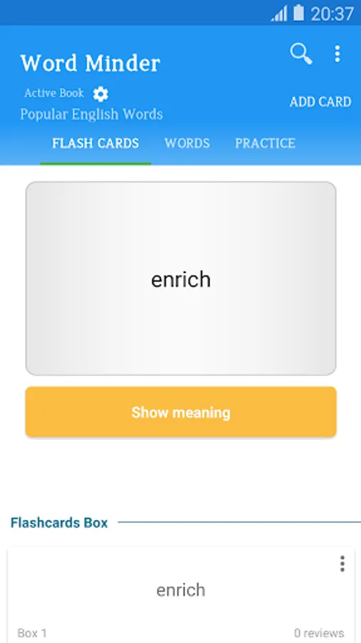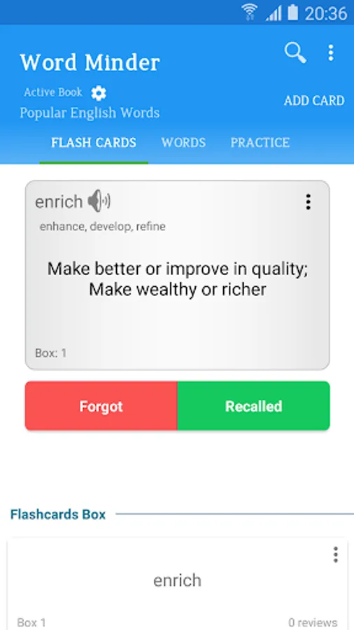 Practice word in Leitner flashcard game then set the word reminder to review words with definition in time intervals even when you are using Facebook or playing with your Phone!
