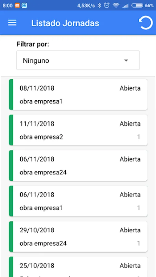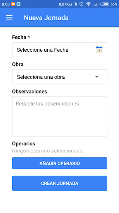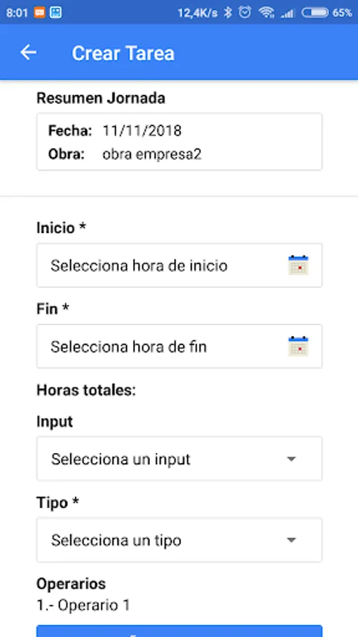 This application is a tool to manage the days of the operators of one or several works. By means of a form, they can indicate the day of each day and detail their corresponding tasks of displacement, diets, work in the work ... They have the possibility of attaching files as images, delivery notes, tickets ...
