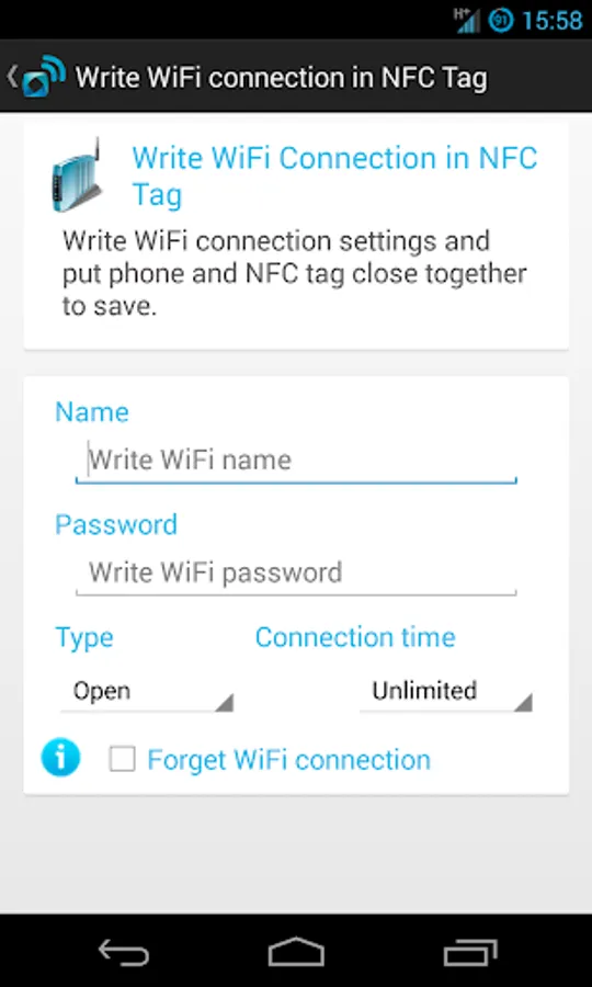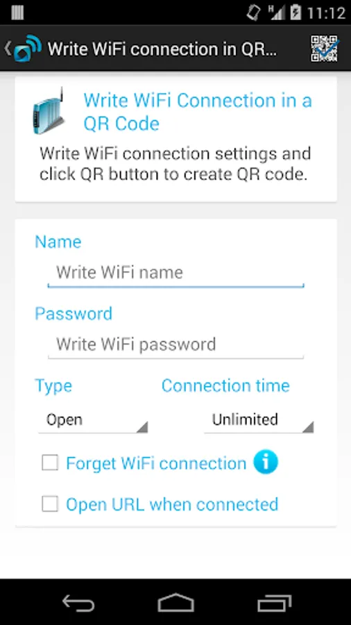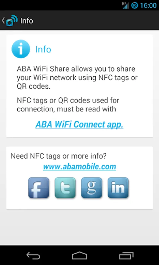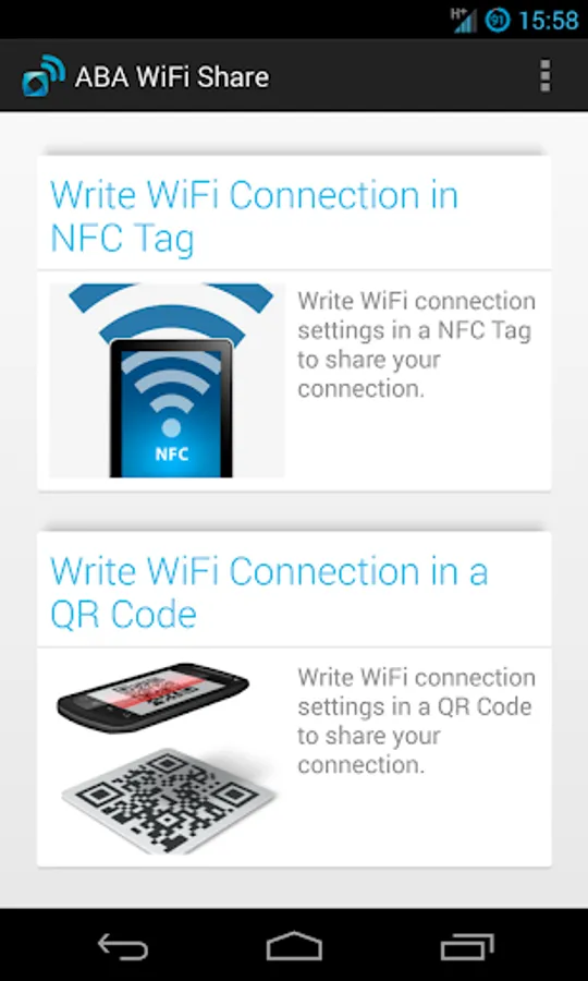 ABA WiFi Share save your WiFi connection in NFC tags or QR codes to share it easily and safely.