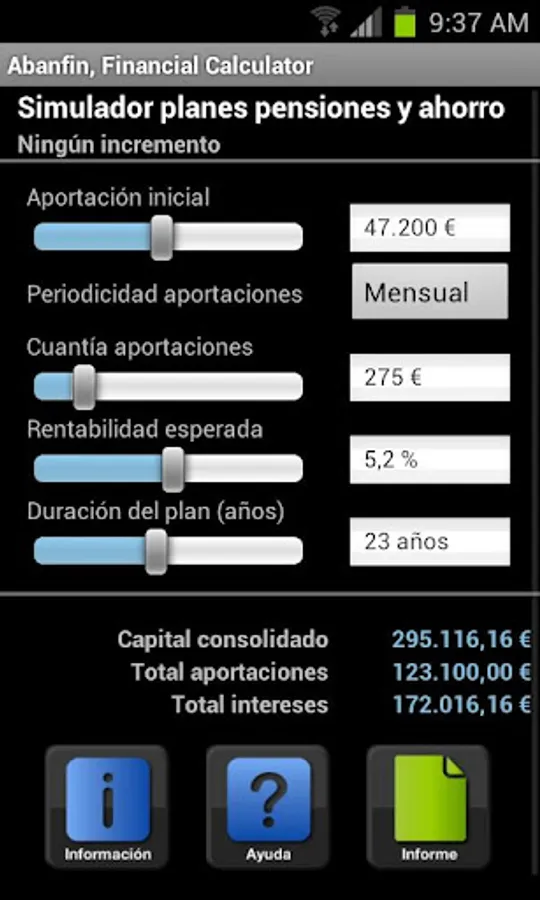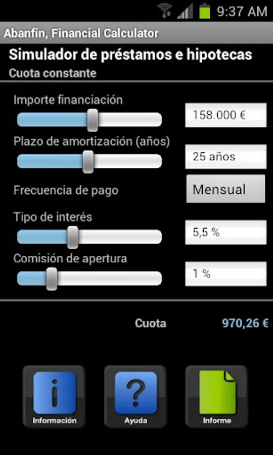 With this application you will have a powerful set of financial calculators which respond to the needs of most common financial calculation in your personal and professional life.