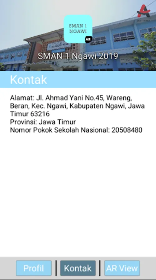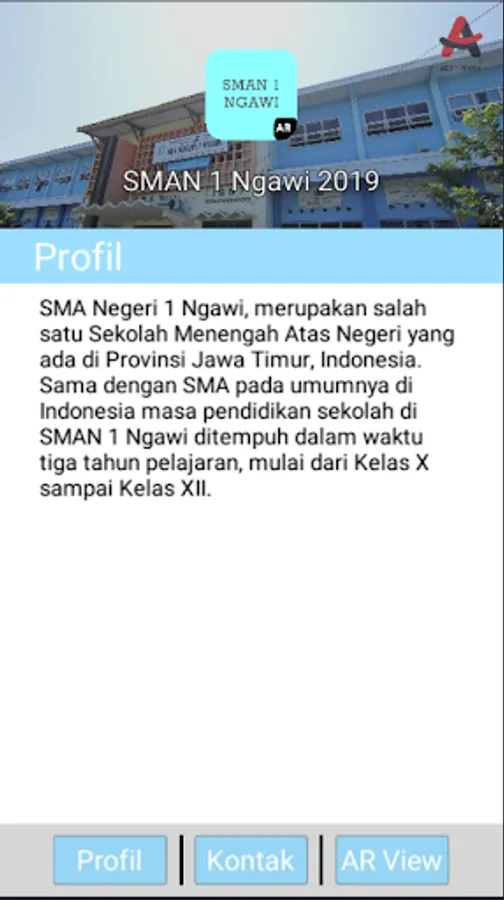 This application contains a profile of SMAN 1 Ngawi. In addition to displaying the Institute's basic profile, this application is also equipped with Augmented Reality which can be used with the Annual Book of Students.