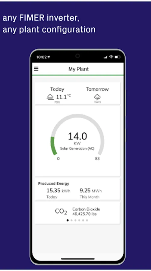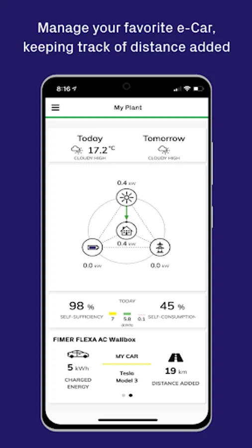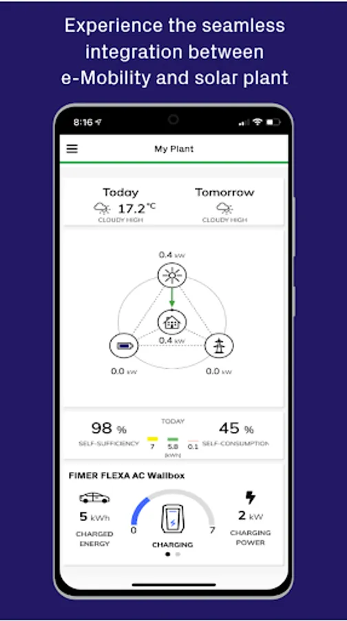 - Compatible with FIMER FLEXA AC Wallbox: configure and manage your e-Car, remotely monitor charging process and trends;