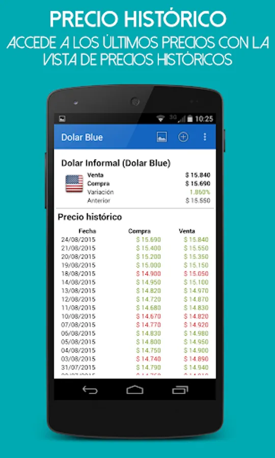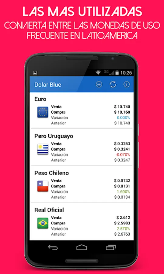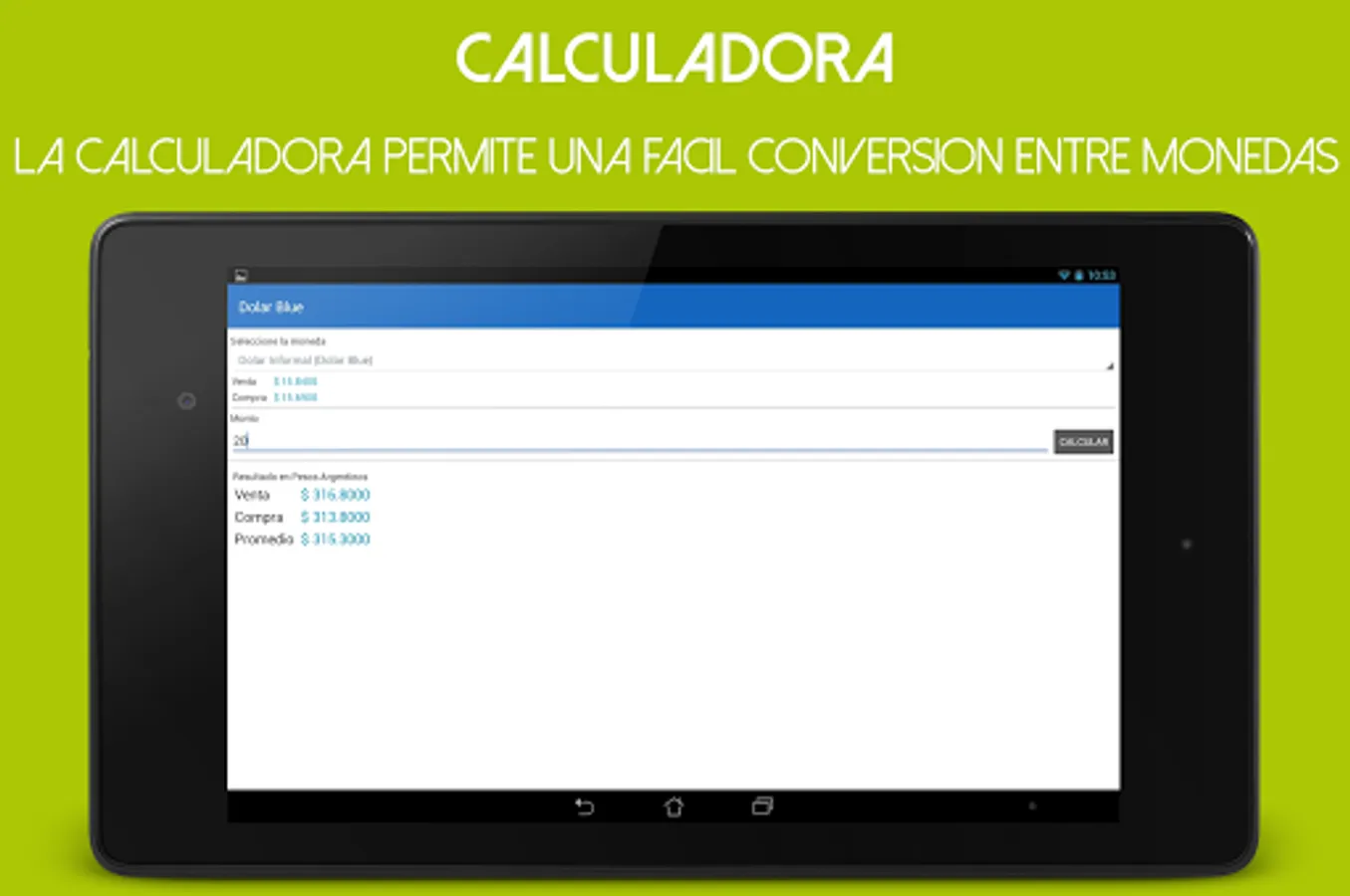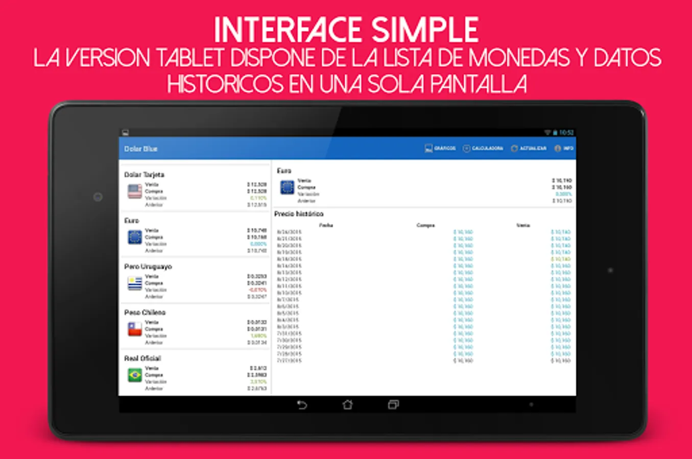 You can know the price of the Official Dollar, informal Dollar (Blue Dollar) and other currencies used in Latin America.
