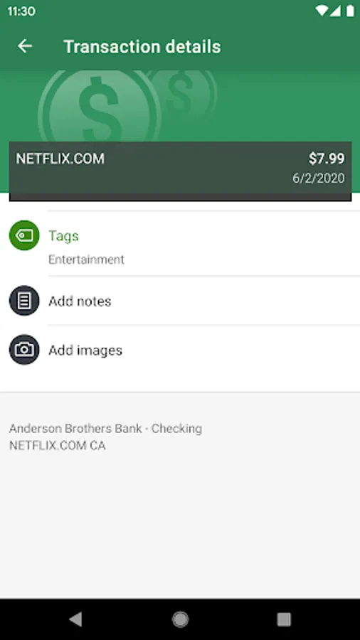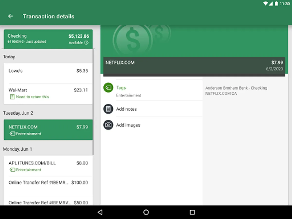 Add Tags, Notes, and Images: You have the ability to stay organized and find exactly what you’re looking for when searching through your finances by enhancing transactions with custom tags, notes, or photos of a receipt or check.