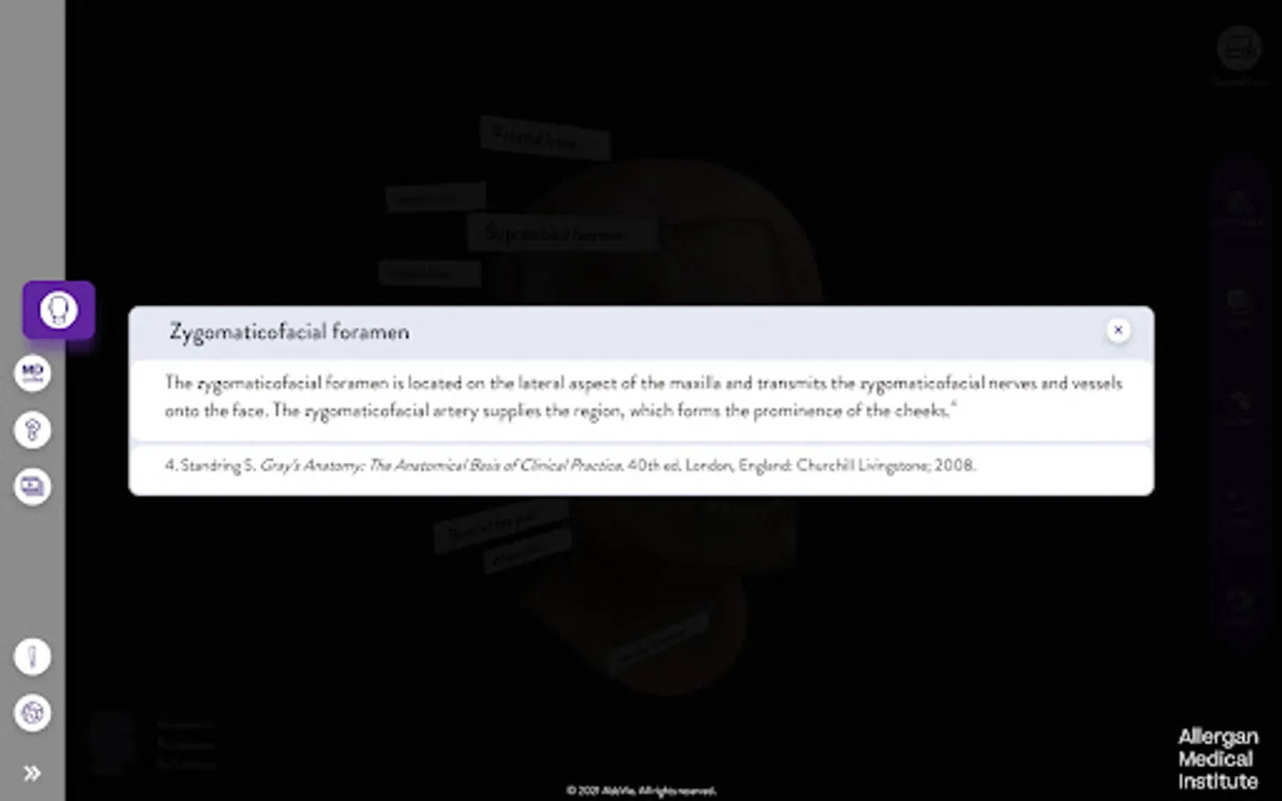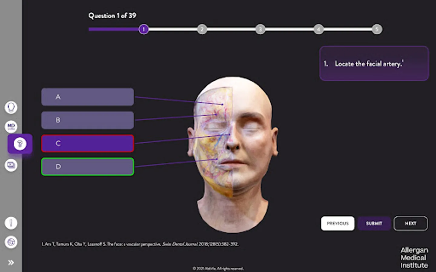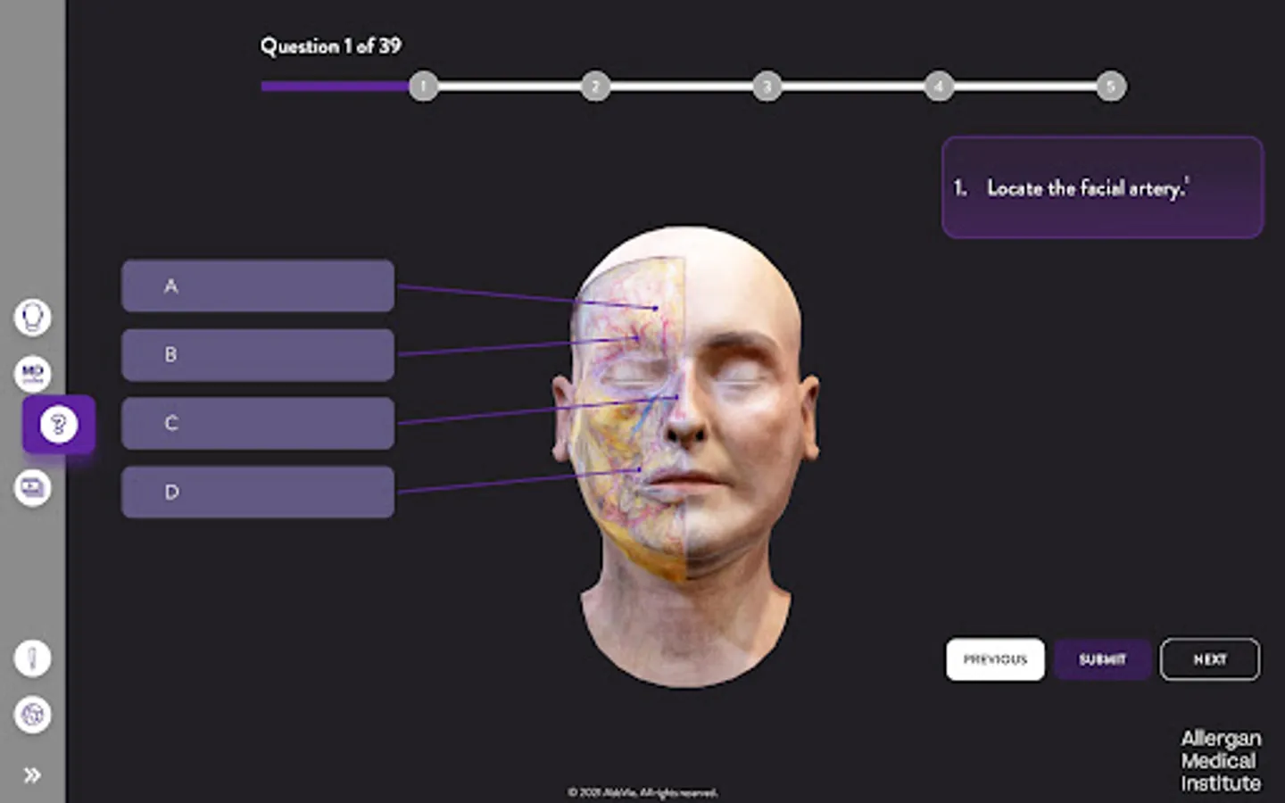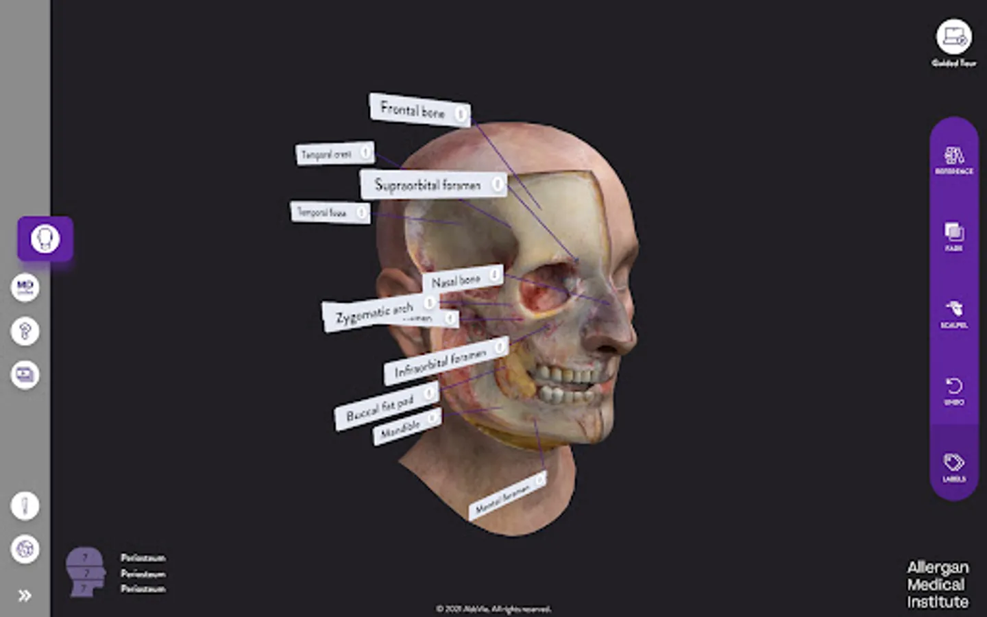 The AMI Facial Anatomy and Cadaver App is a teaching tool that uses a virtual cadaver model that has been digitally reconstituted, with a high degree of realism, from a cadaver dissection done in an anatomy lab. Experience it in 360- degree view with layers of tissue dissected to understand the anatomical structure better.