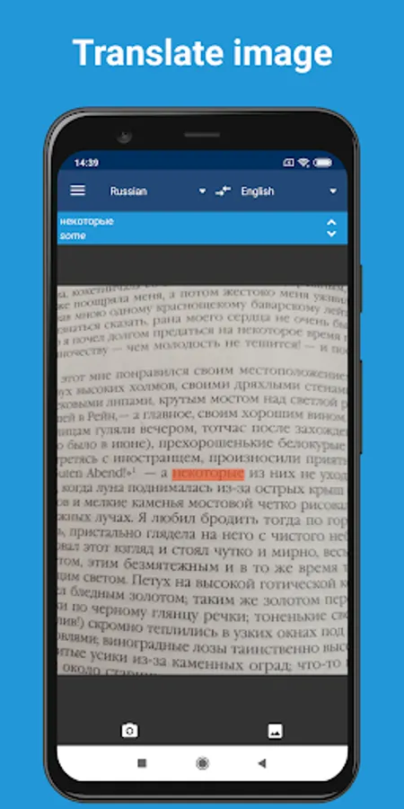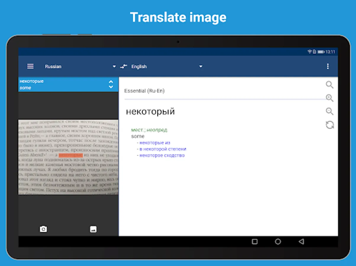 Images translation: recognition and translation of words from the mobile device’s camera or from images on your phone. To translate a word just tap it on the image.
