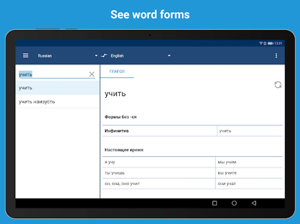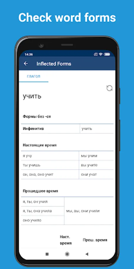 On the “Inflected forms” tab, you can quickly see declension of nouns, conjugation of verbs, etc.