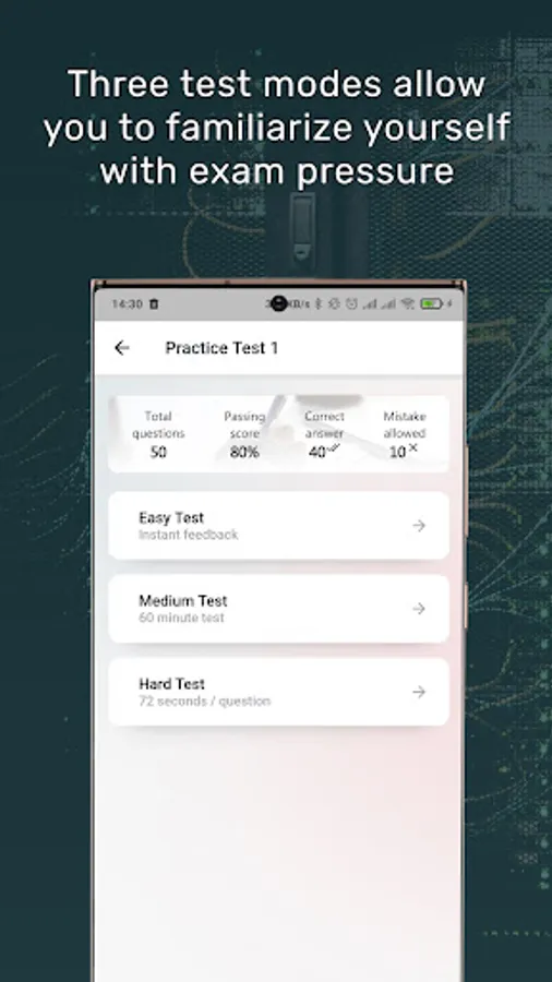 • CCNA Simulated tests: Each mock test is simulated as the real test format with the same number of questions and time limit. Once you finish the test, you will see your score and review section that records all your question results.