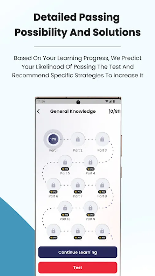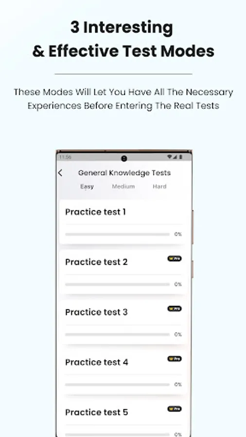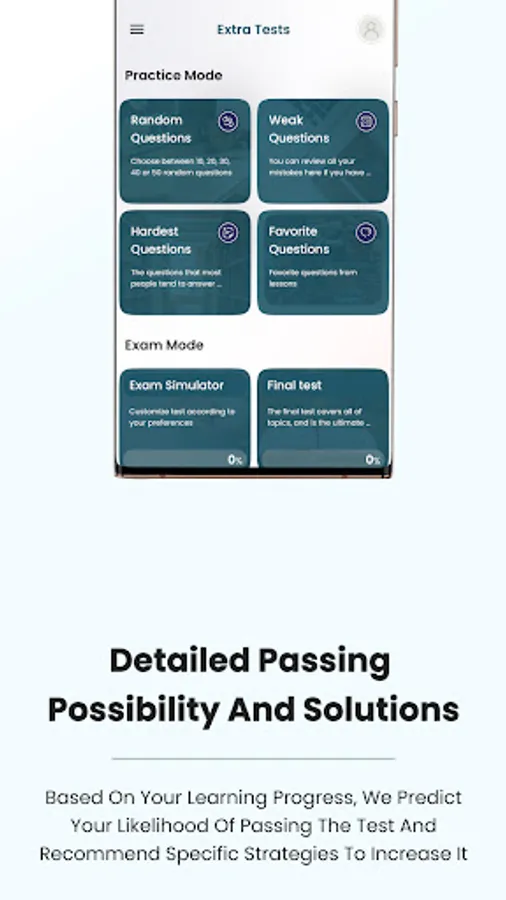 • Mock test: Various full tests let you familiarize yourself with test format. When you finish the test you will see your score and review all the questions.