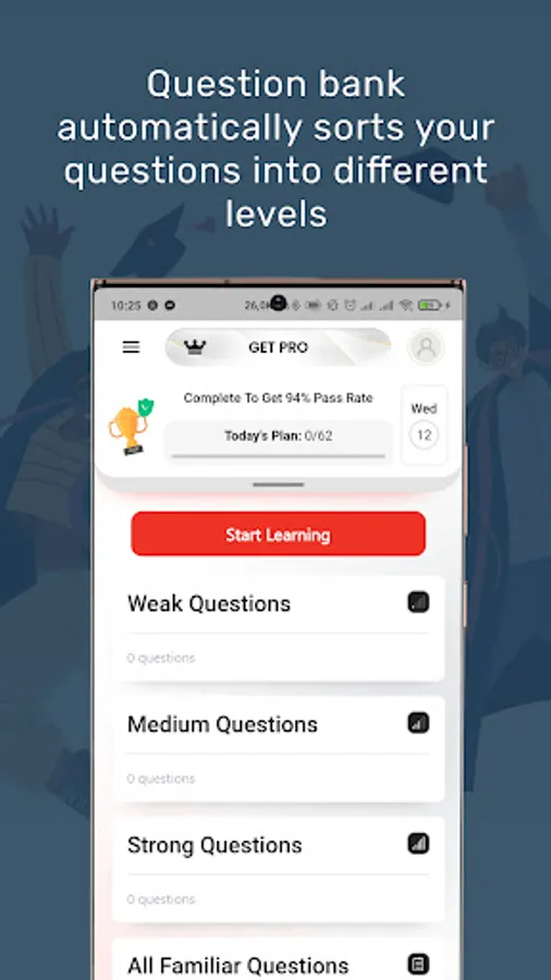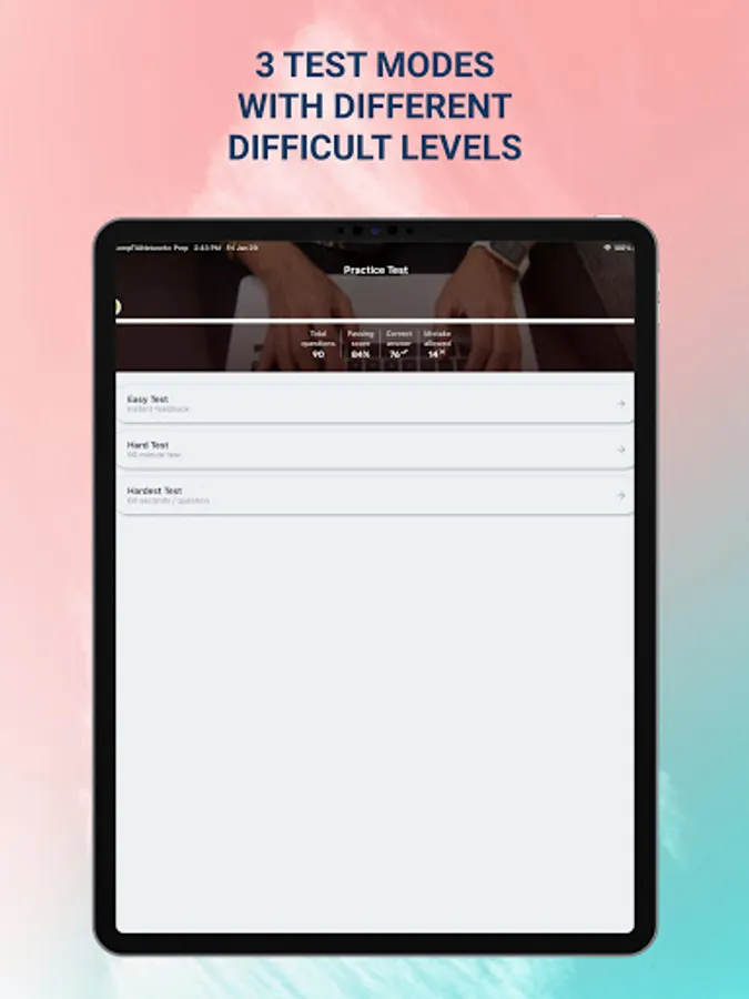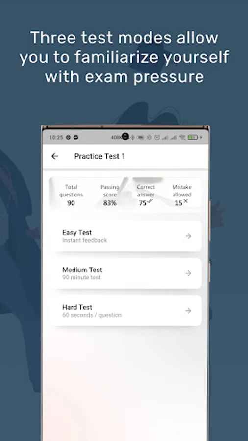 • Mock test: mock test simulates the real test format. When you finish the test you will see your score and review all the questions.
