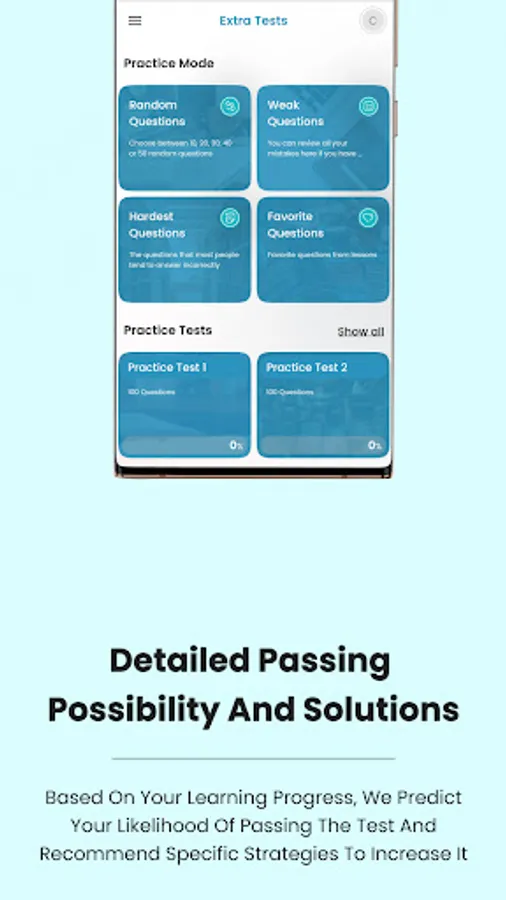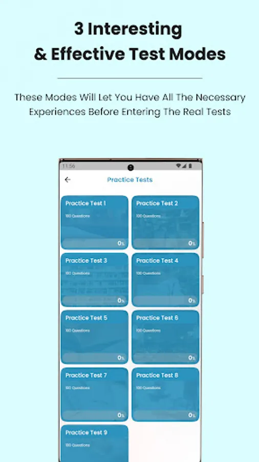 • Mock test: Various full tests let you familiarize yourself with test format. When you finish the test you will see your score and review all the questions.