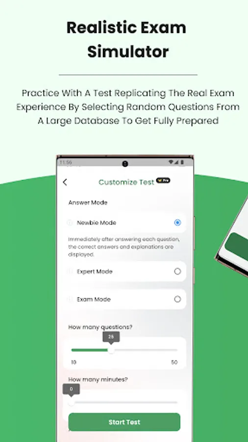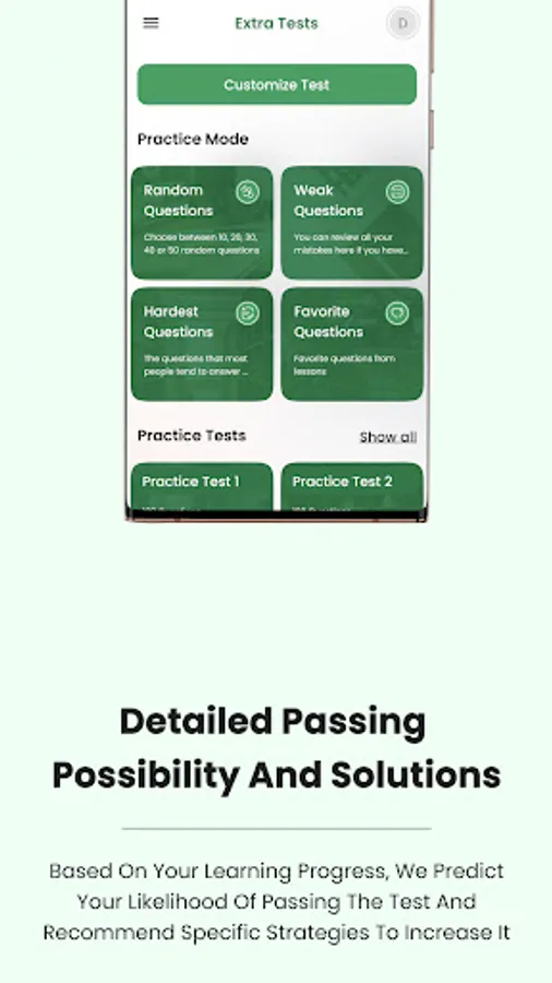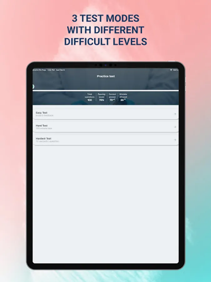 • Mock test: Various full tests let you familiarize yourself with test format. When you finish the test you will see your score and review all the questions.