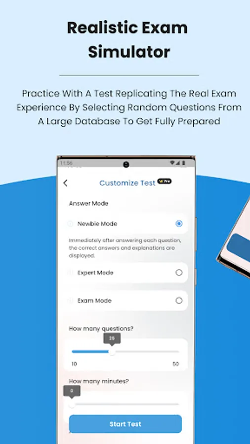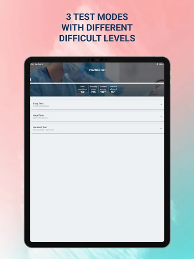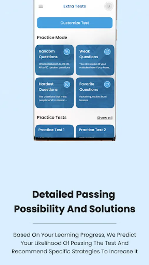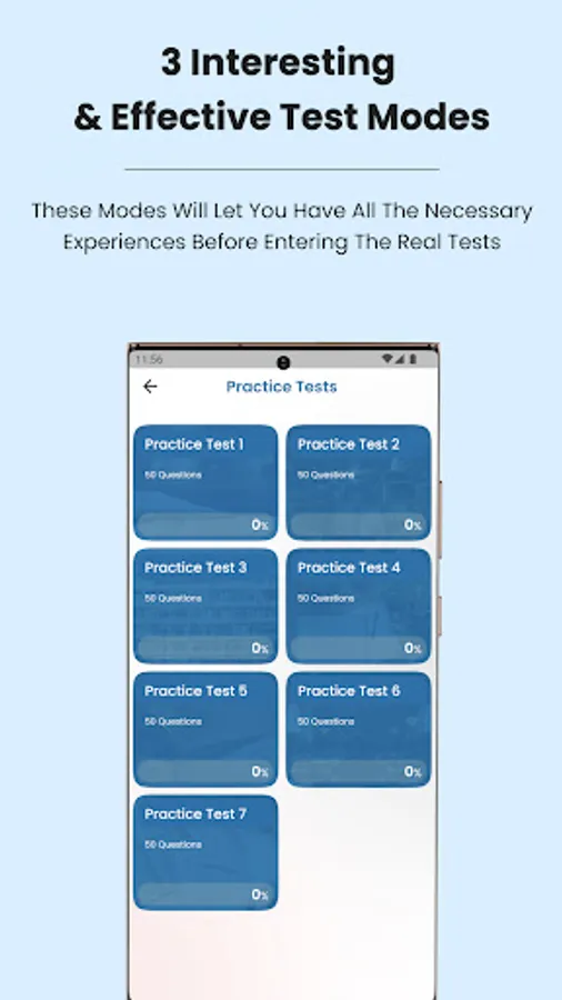 • Mock test: Mock test simulates the real test format. When you finish the test you will see your score and review all the questions.