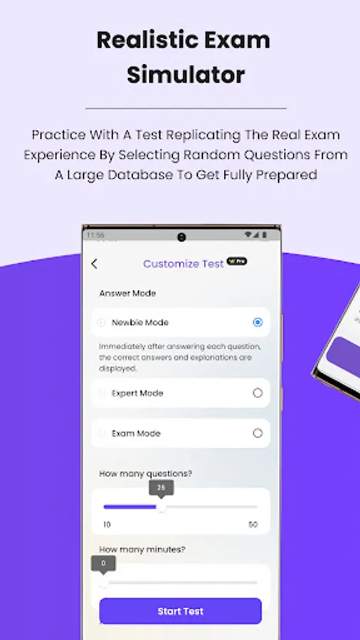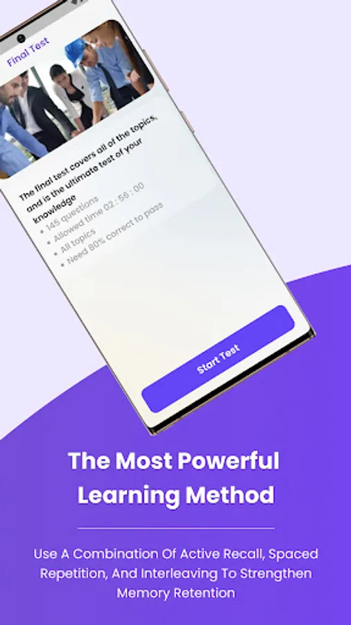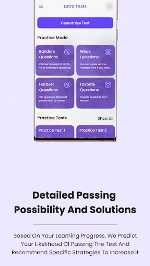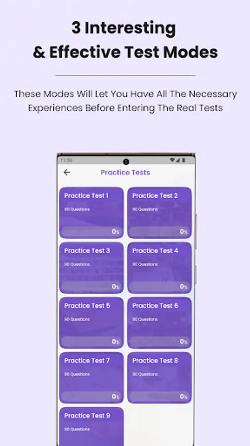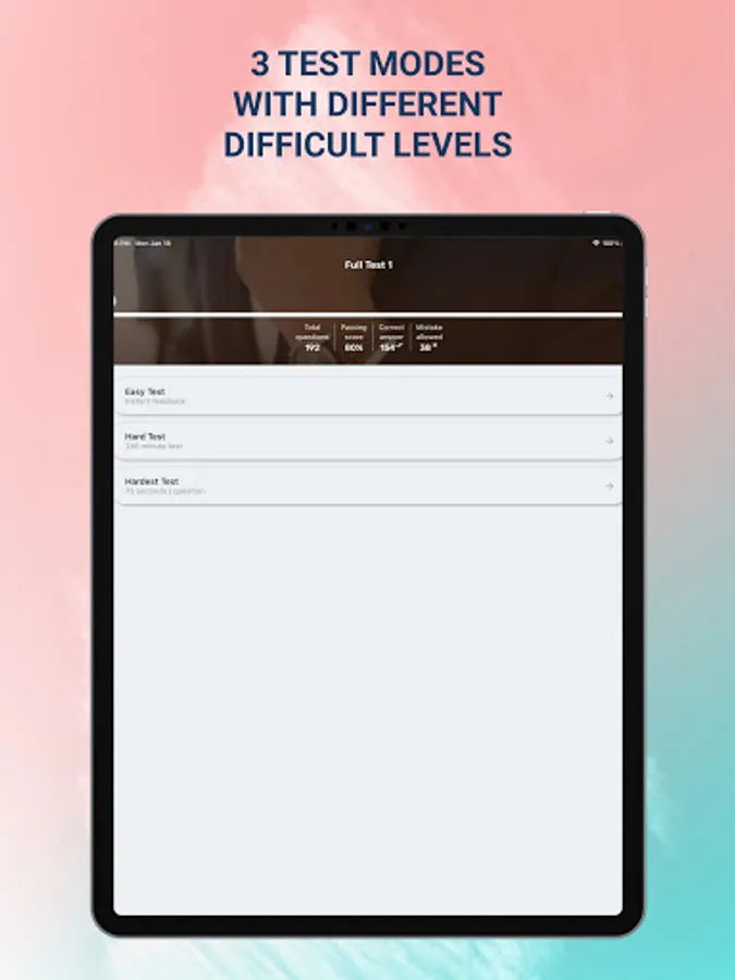• Mock test: Mock test simulates the real test format. When you finish the test you will see your score and review all the questions.