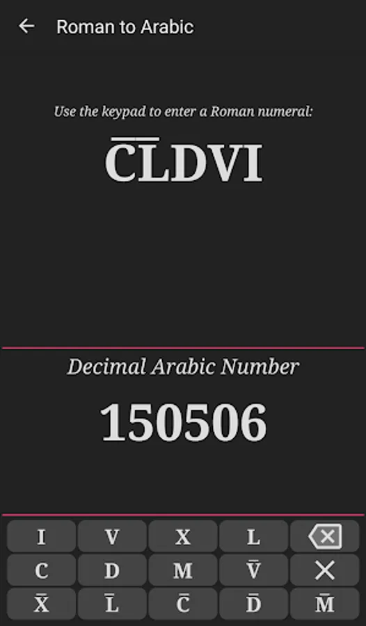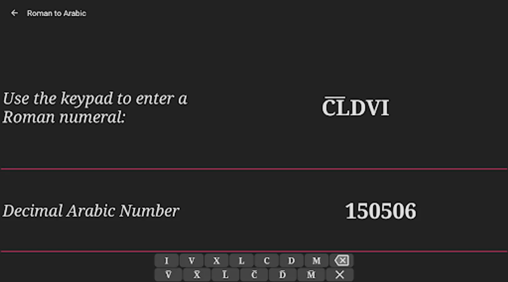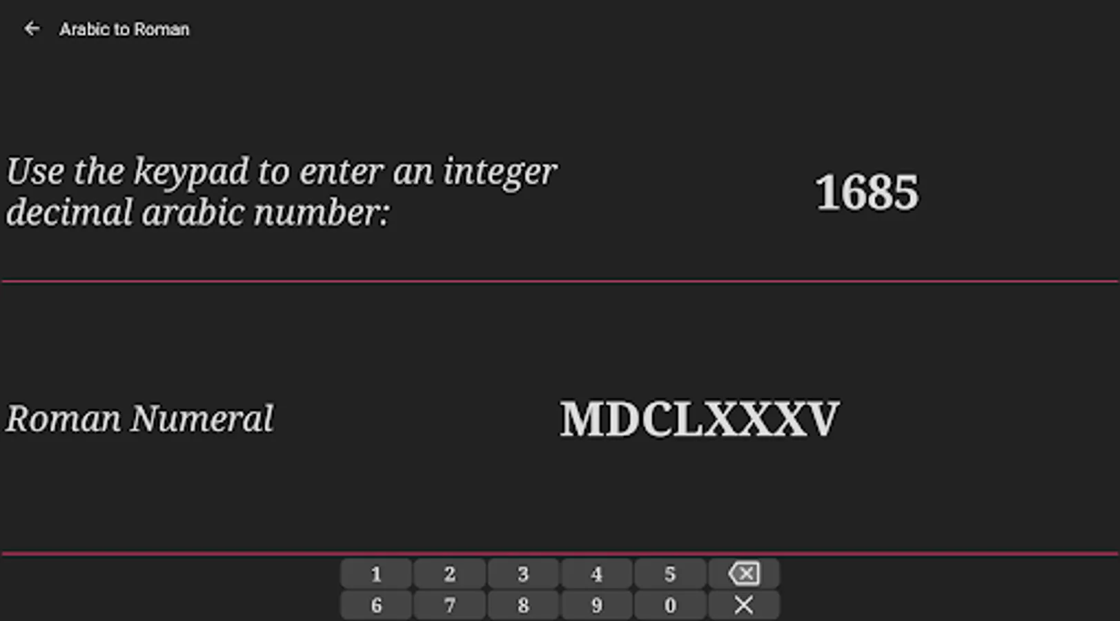 This app allows you to convert arabic numbers to roman numerals and viceversa in an effective way.