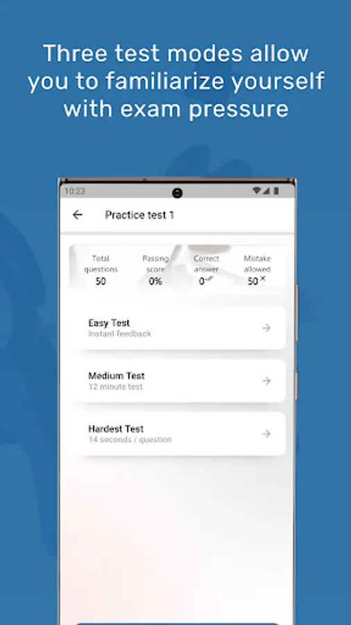 - 3 Interesting Test Modes: 3 different test modes with increased difficult level let you experience the test in various ways.
