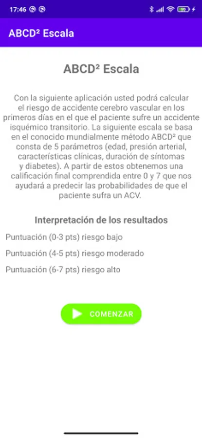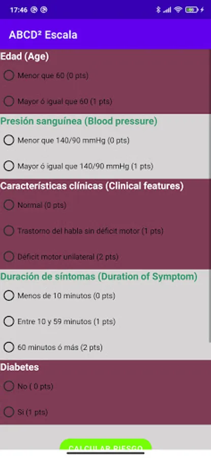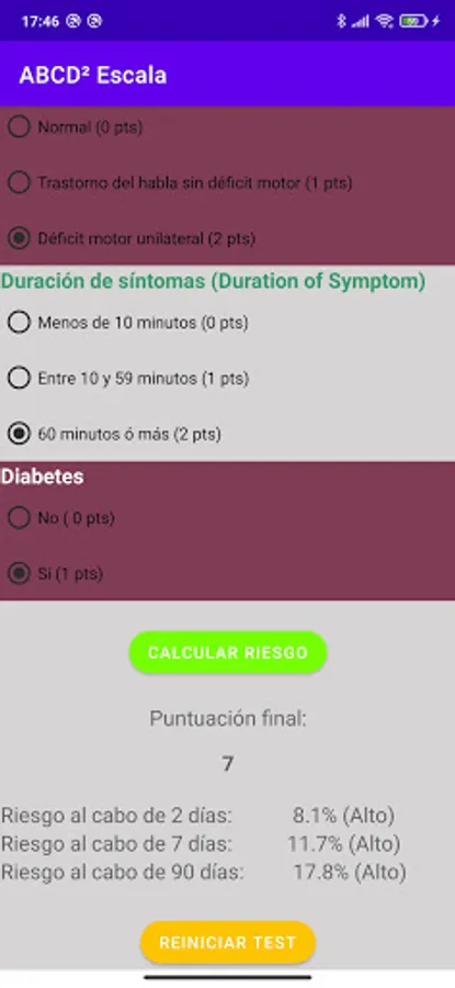 With the following application you will be able to calculate the risk of stroke in the first days in which the patient suffers a transient ischemic attack. The following scale is based on the worldwide known ABCD² method, which consists of 5 parameters (age, blood pressure, clinical characteristics, duration of symptoms, and diabetes). From these we obtain a final score between 0 and 7 that will help us to predict the probabilities that the patient will suffer a stroke.