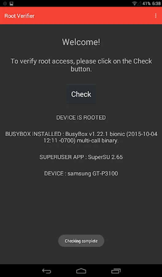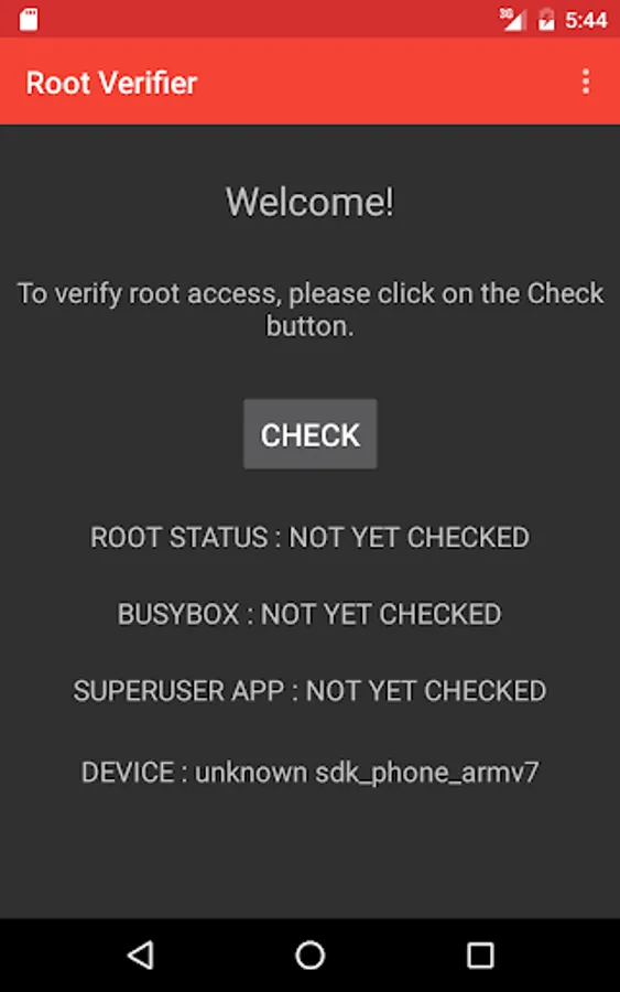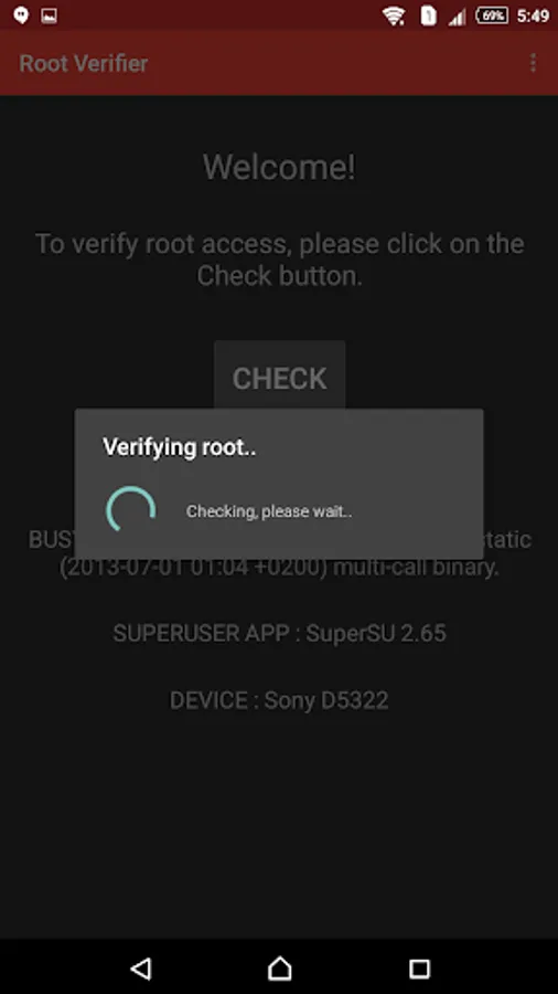 This application is a simple app which checks if your Android device has Superuser access ("root") or not. By simply clicking on the check button, users can verify if their Android device is properly rooted or not. Also, users can check if they have busybox installed on their Android device along with the version of busybox.