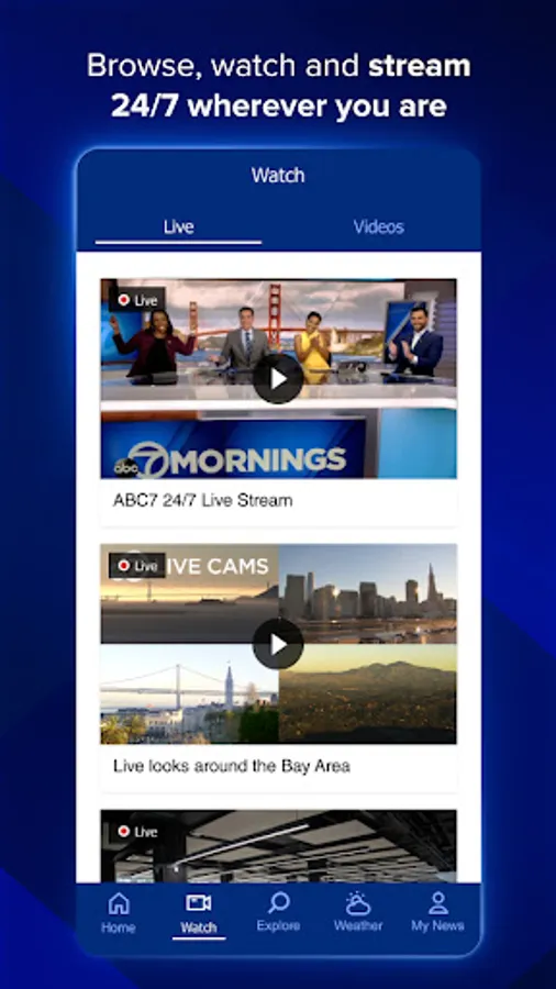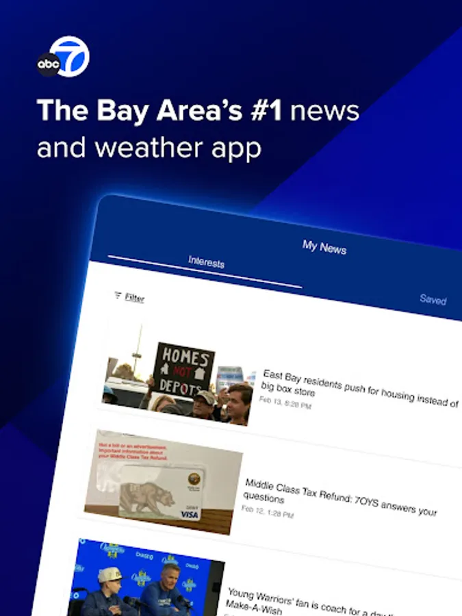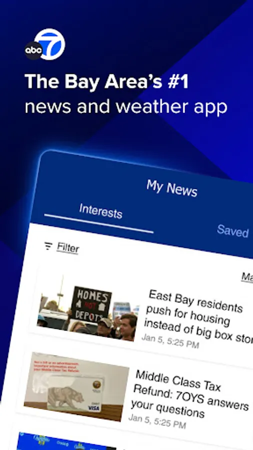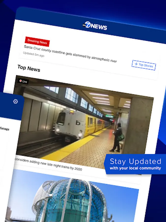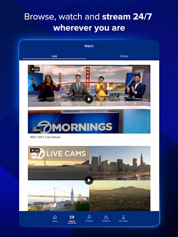 Stream live newscasts with the ABC7 Bay Area app. Stay up-to-date on local news and weather, along with national top stories. Plus, customize the app based on your interests.