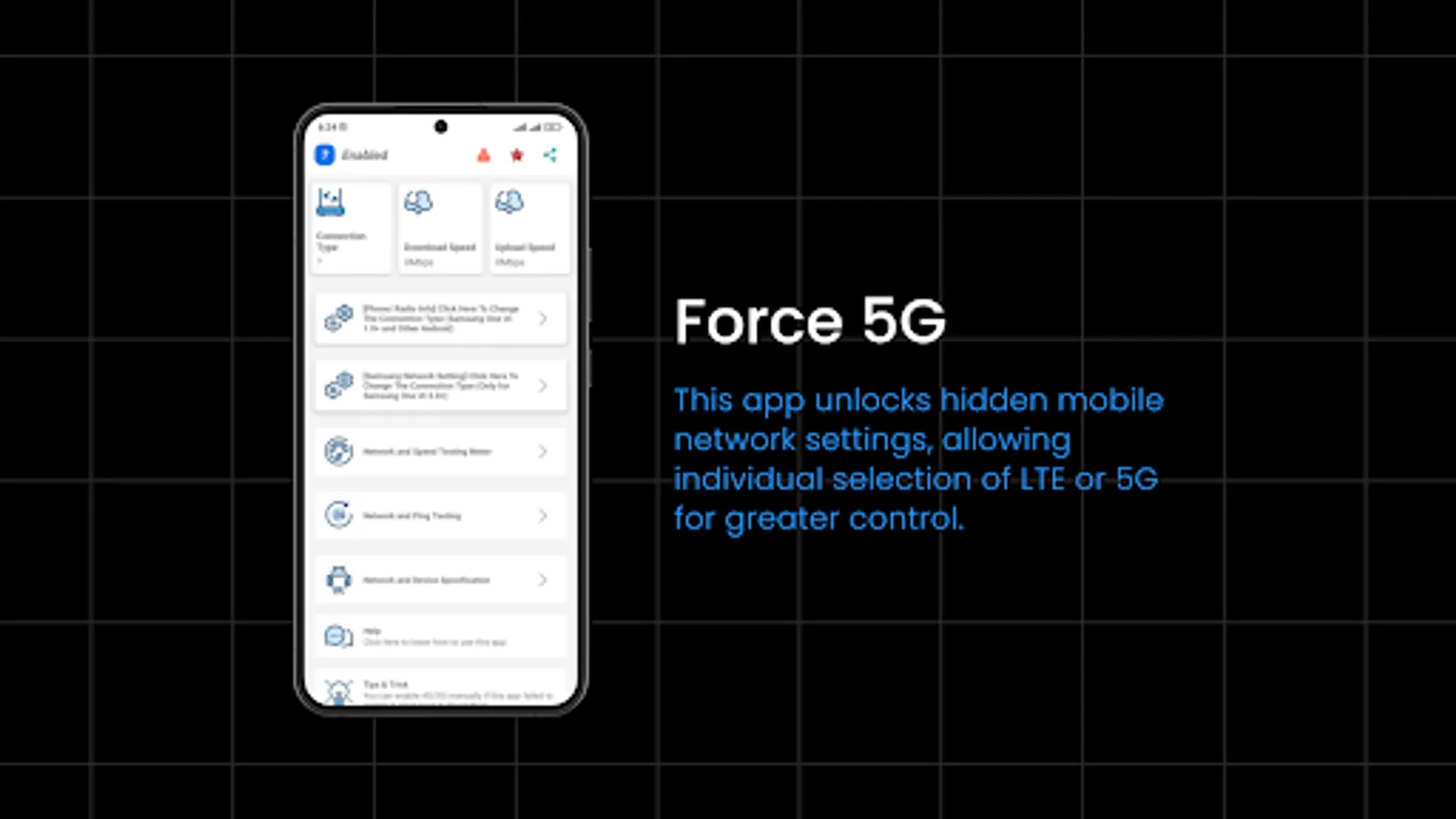 Force 5G is the ultimate app for unlocking hidden mobile network settings on Android devices. By default, most Android devices automatically connect to the strongest network signal available. Force 5G allows users to manually select between LTE or 5G networks, providing greater control over the connection.